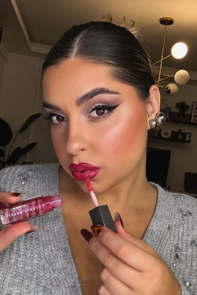 If you want bold lips without heavy shadow, smoky liner gives your glossy red the perfect contrast.