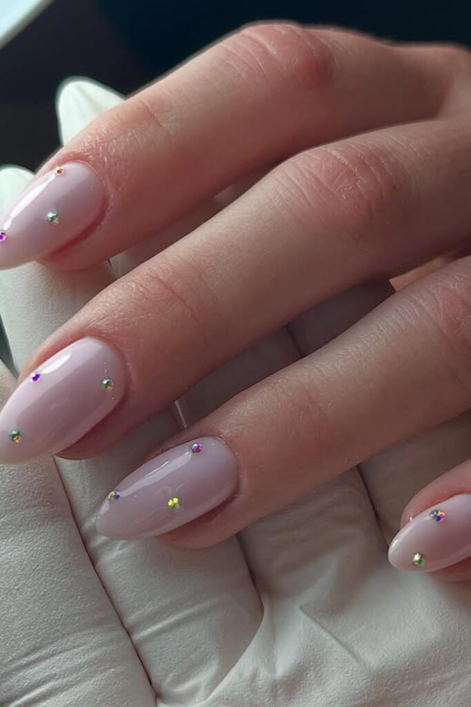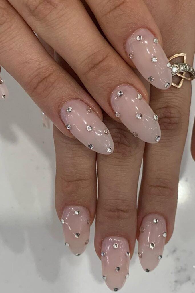 A soft blush base keeps things simple, while evenly spaced clear crystals give a clean, dotted effect that feels intentional, not random.