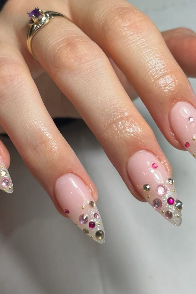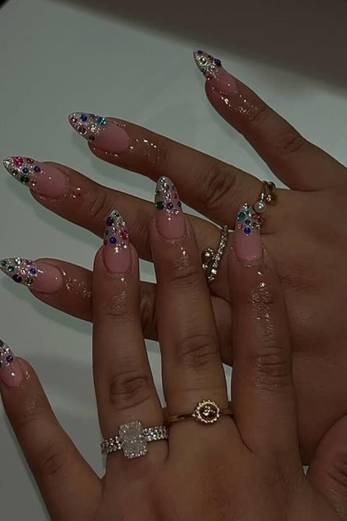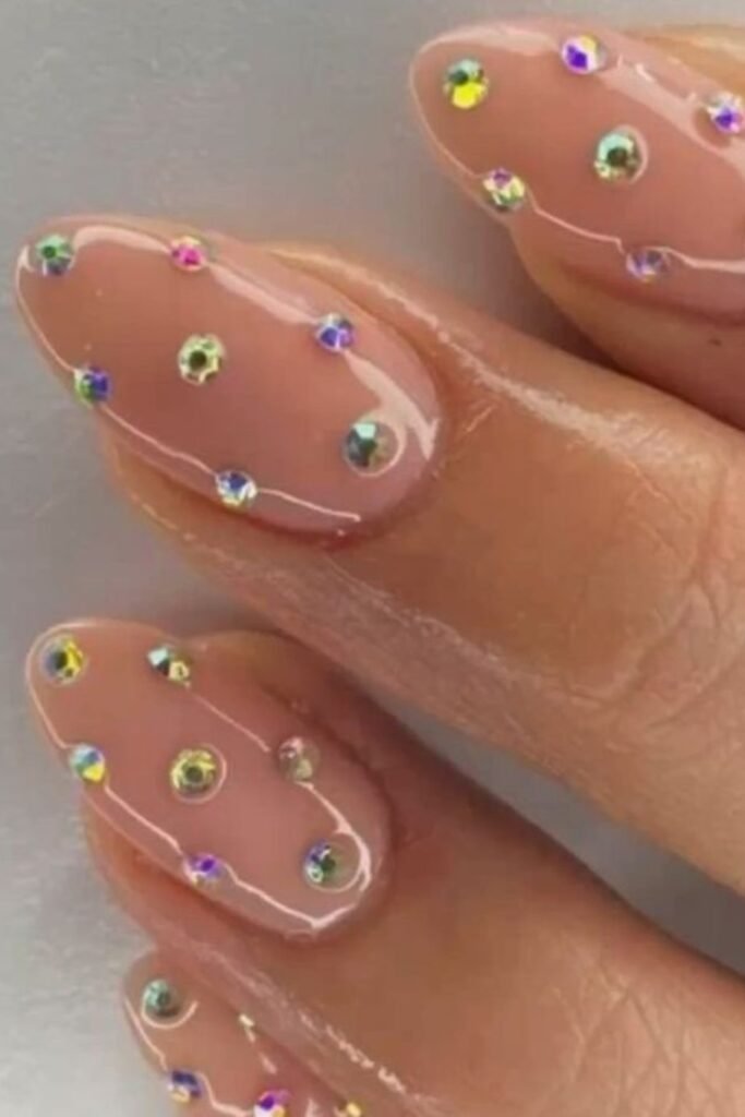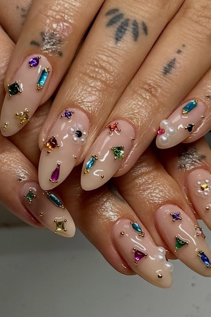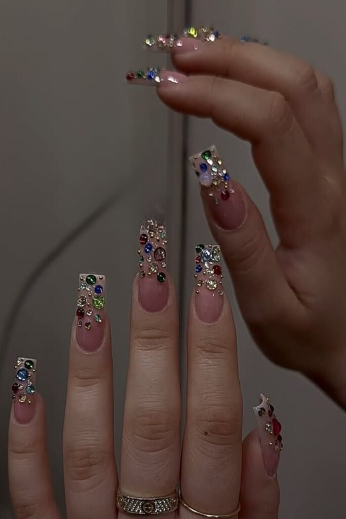 A clean nude base keeps everything wearable, while multi-colored rhinestones stacked near the tips add a playful, jewelry-like feel.