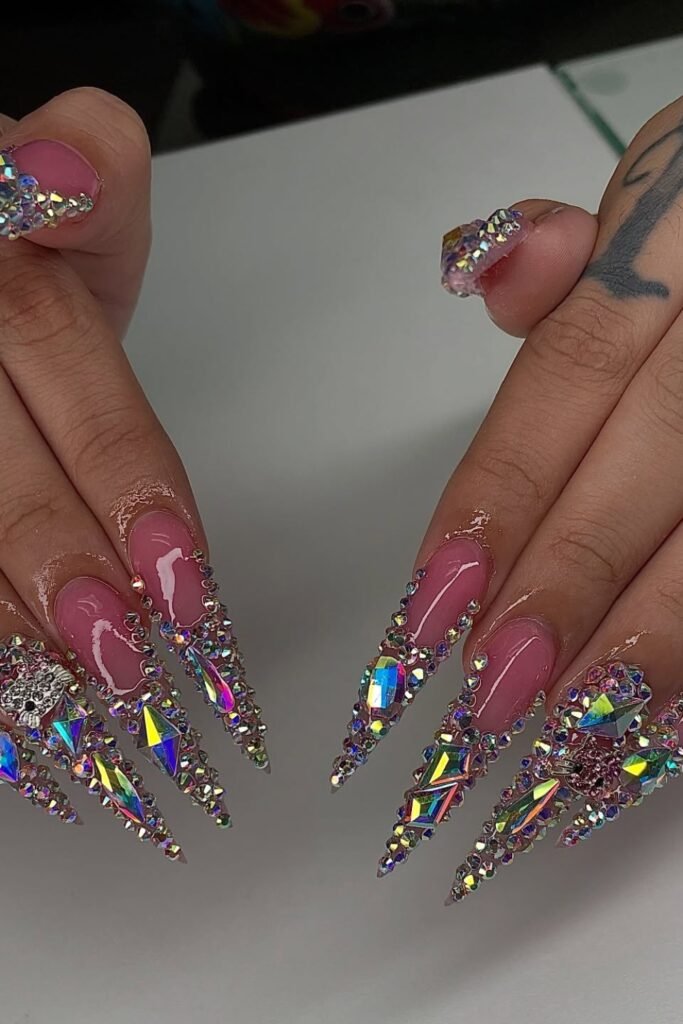 You will see that a milky base softens the stiletto shape while scattered rhinestones look like they’re floating rather than sitting in heavy clusters.