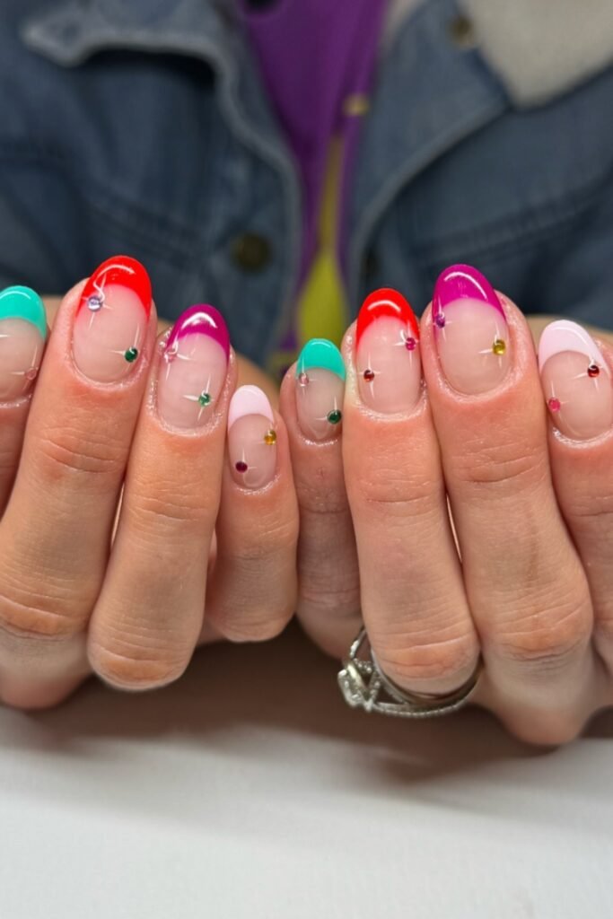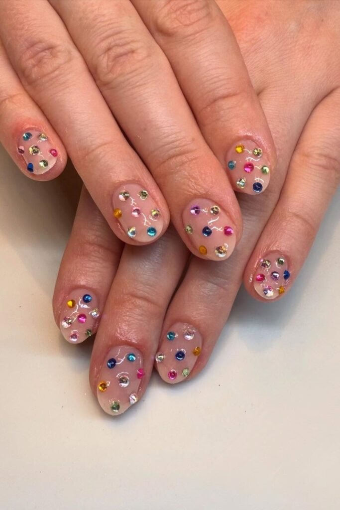 Even short nails can play with color when your base stays sheer. If you keep a natural nude, you can let colorful rhinestones create a fun, confetti-like effect.