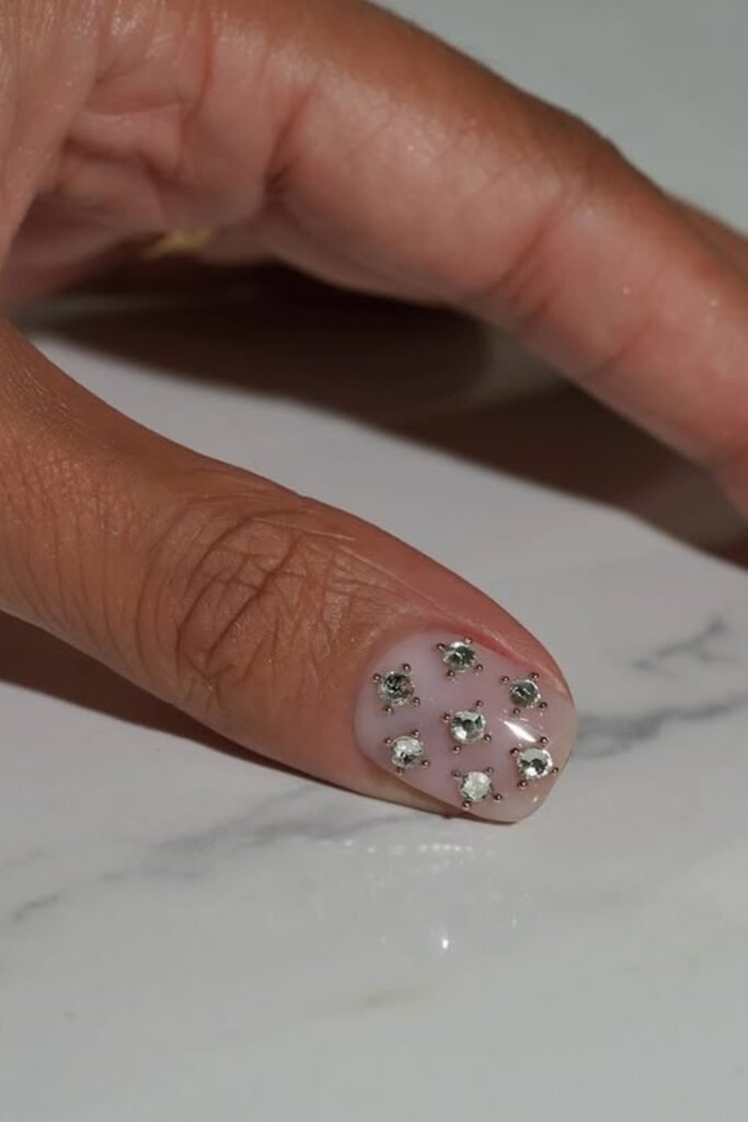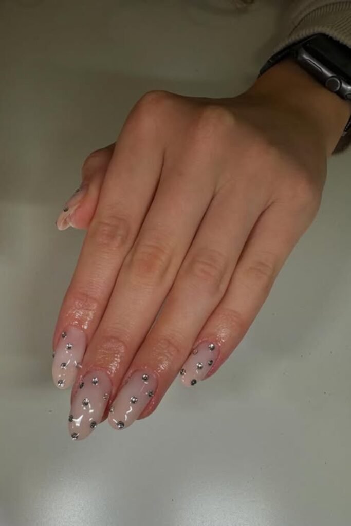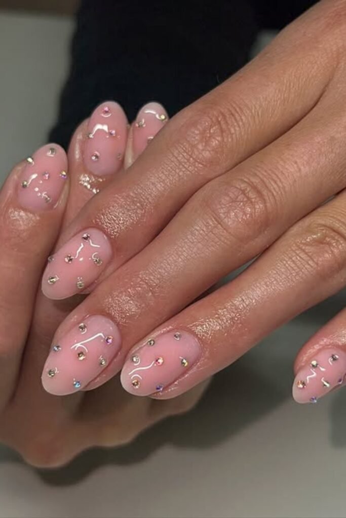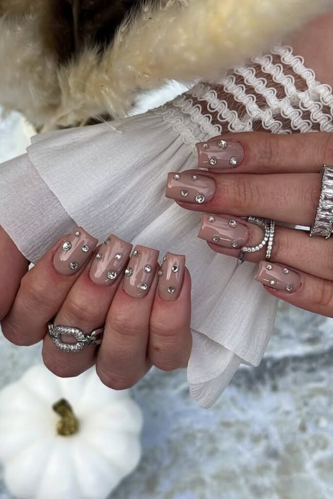 The soft nude base keeps your nails looking clean, while evenly spaced small rhinestones add just enough sparkle without taking over.