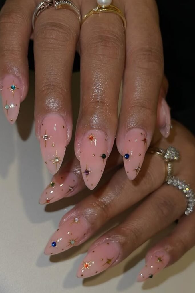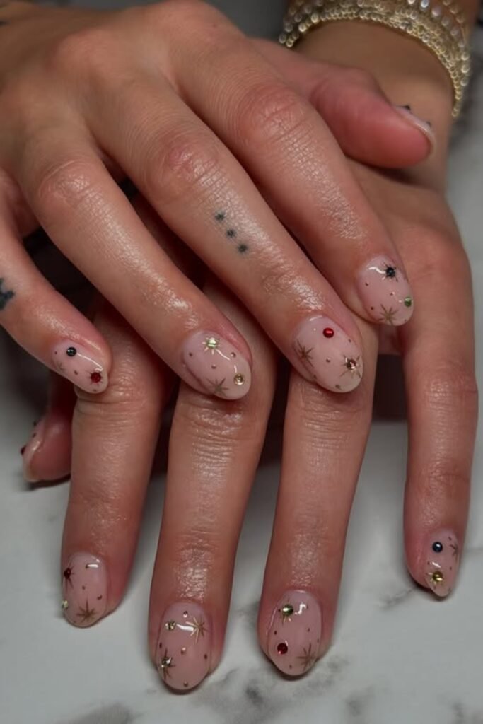 A sheer nude base gives you that bare but better vibe, while random pops of colorful gems add personality without taking over.
