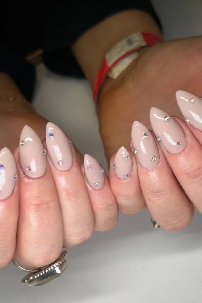 A nude almond shape keeps everything elegant, and when you spread tiny crystals evenly across each nail, you can add texture without weight.