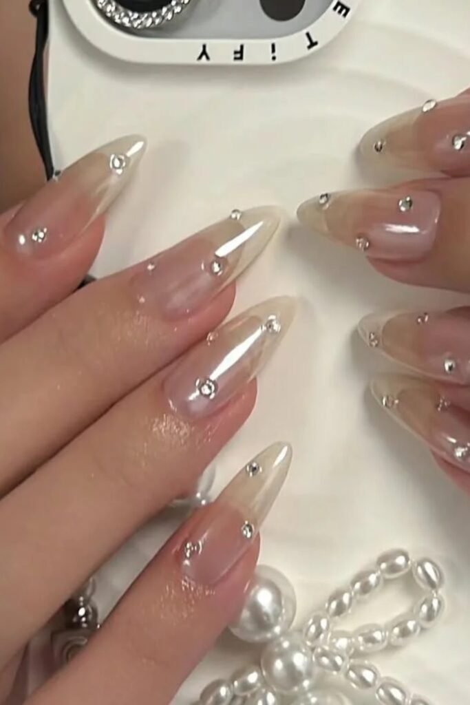 If you use a milky nude base, you can keep everything soft while letting single rhinestones add quiet sparkle without distraction.