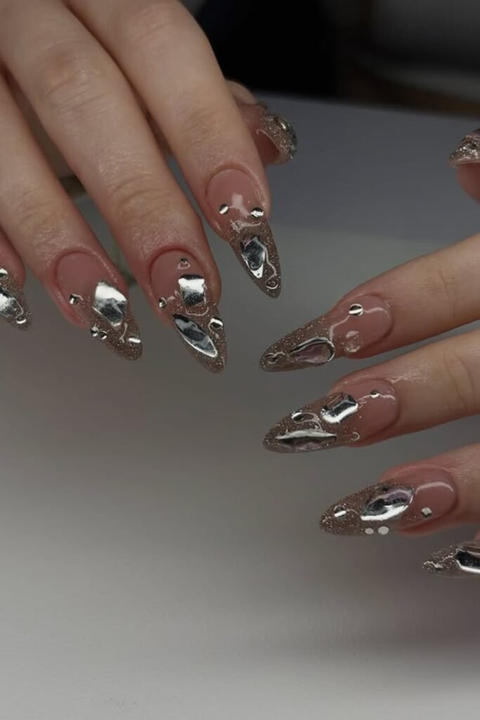 The soft nude keeps your base calm, while silver chrome shapes and a few rhinestones create a molten, jewelry-like finish.