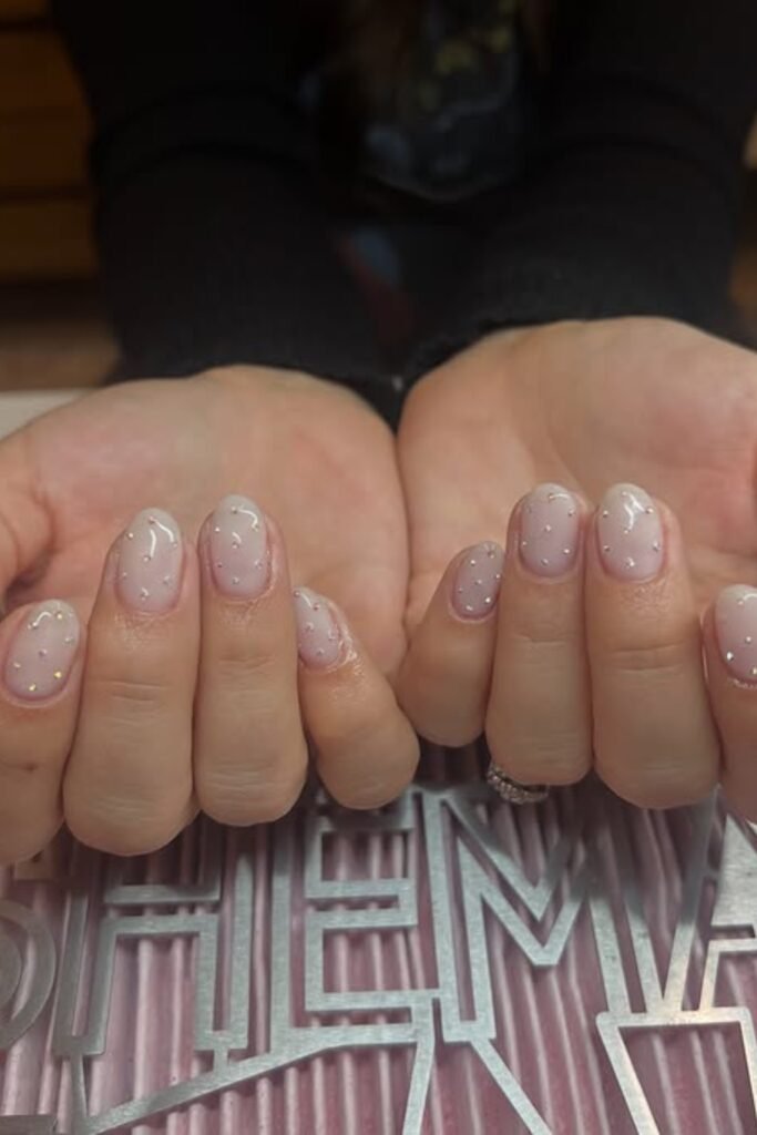 A sheer pink base keeps your nails looking natural, while micro AB crystals catch light without feeling heavy or flashy.