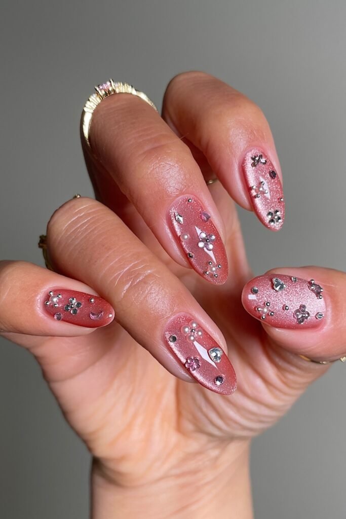 You can keep things soft and feminine with pink, but scattered rainbow stones push it into glam territory.