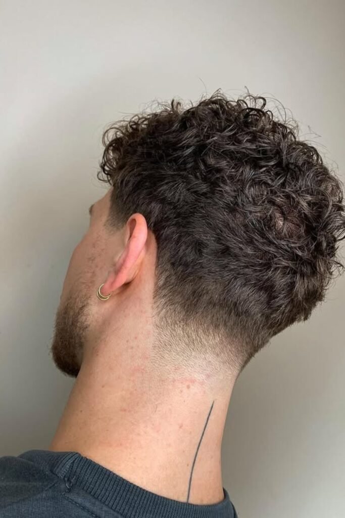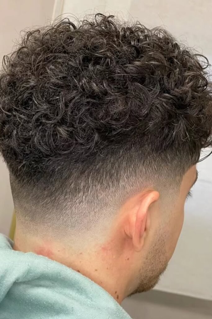 You can see that the fade starts low near your neckline and blends softly into the curls above, keeping your haircut balanced.