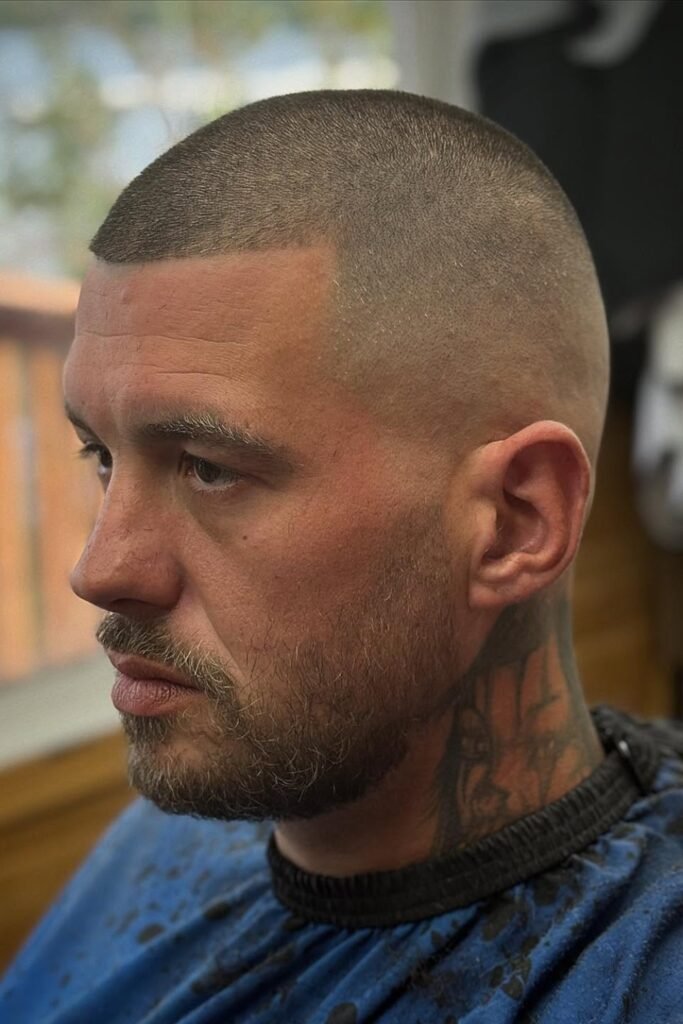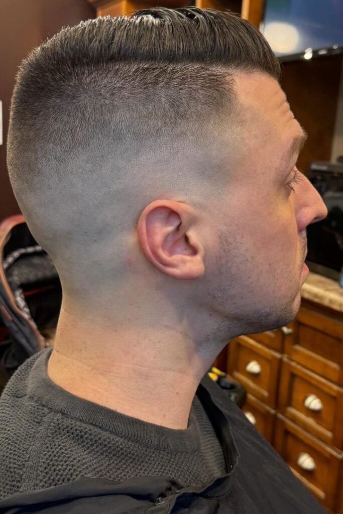 The skin fade blends straight into a tight buzz on top, giving a hard, clean finish that always looks intentional.
