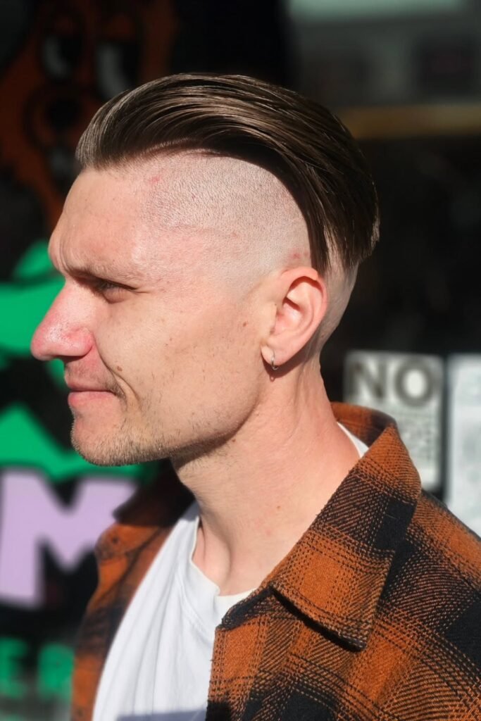 The sides are taken straight down to skin and pushed high, which makes the slicked-back top stand out even more.