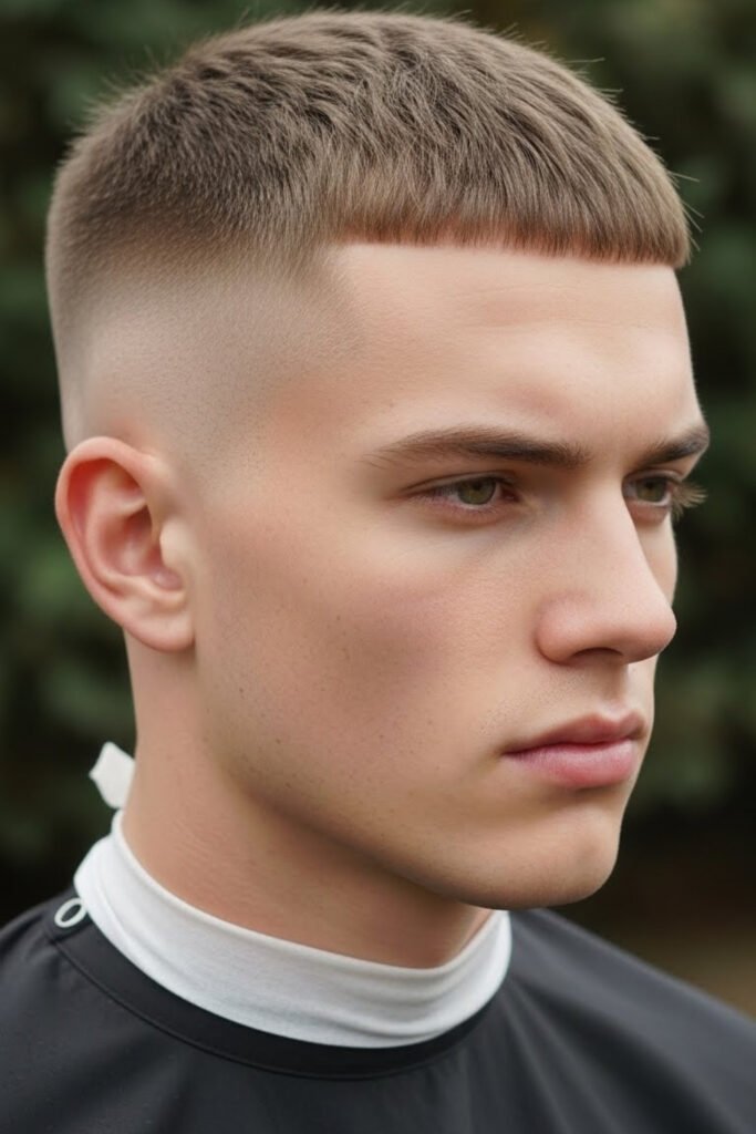 You can ask your barber for a low-to-mid skin fade with a short, even crop on top, and keep the edges soft so it grows out clean instead of harsh.