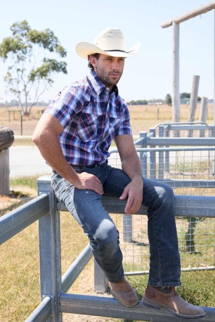 You should start with a brown plaid western shirt, light blue jeans, and a tan cowboy hat, you’ll keep things grounded and practical.
