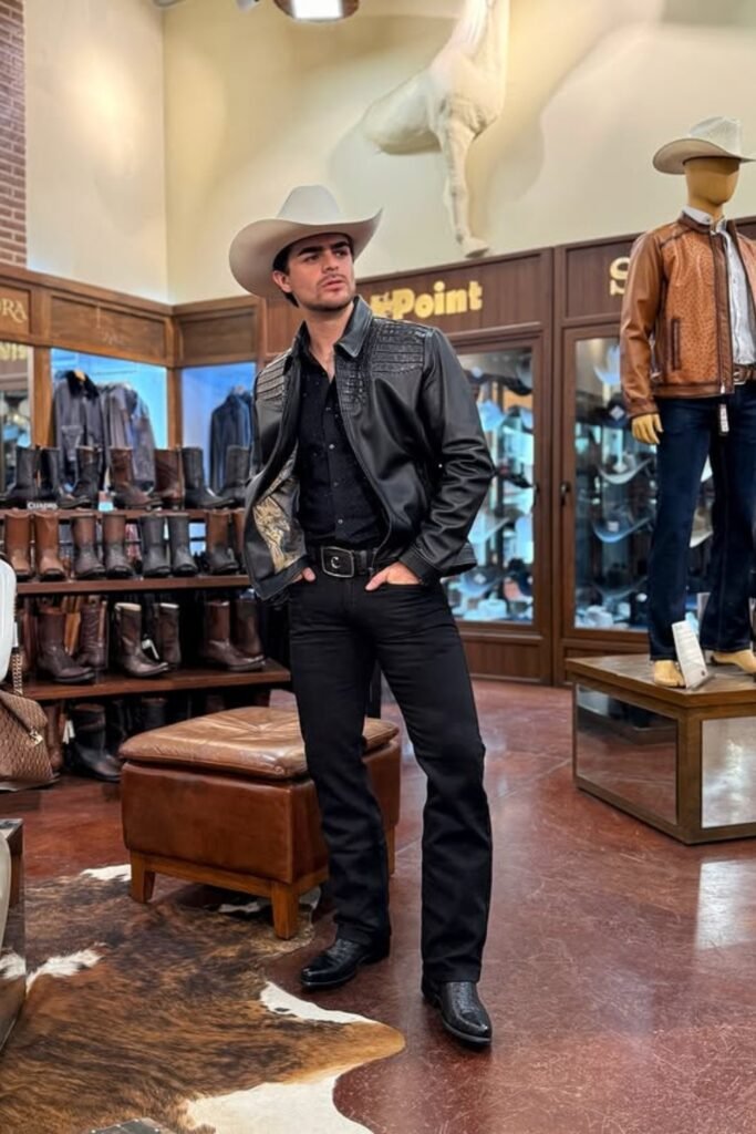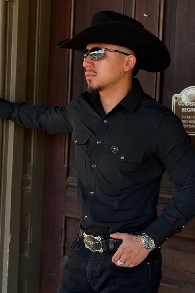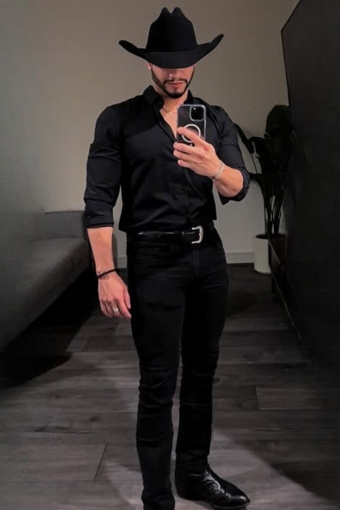 If you want a clean, powerful look without overdoing it, you should start with a fitted black western shirt and black jeans, you’ll create a sharp base.