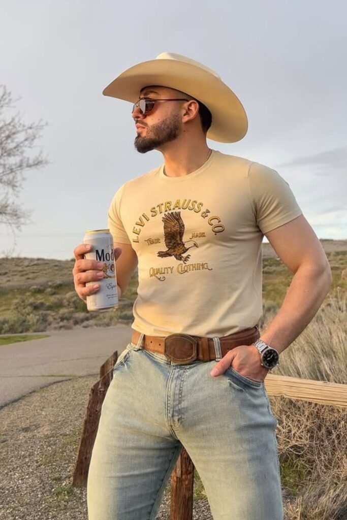 You don’t need a full western shirt to make this work. You can go with a fitted graphic tee and blue jeans, you’ll stay relaxed while still feeling stylish.