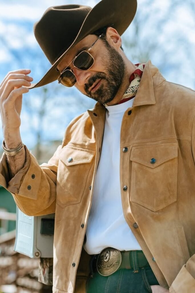 You can pair it with light blue jeans to keep the outfit balanced, then finish with classic boots and a neutral cowboy hat, you’ll notice it feels rugged yet styled.