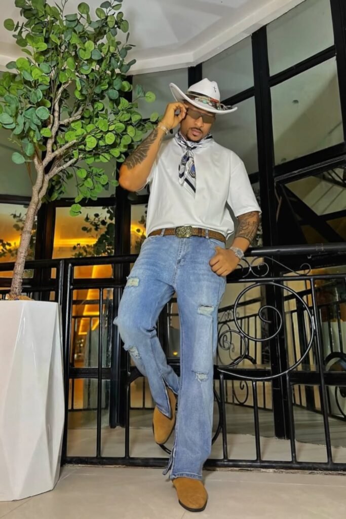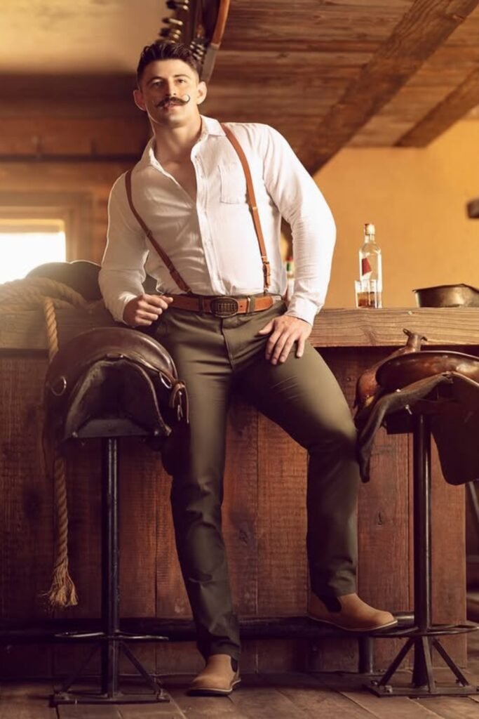 You don’t always need denim to get a strong western feel. You can wear a fitted white shirt with suspenders and tailored trousers, you’ll instantly get that old-school cowboy vibe.