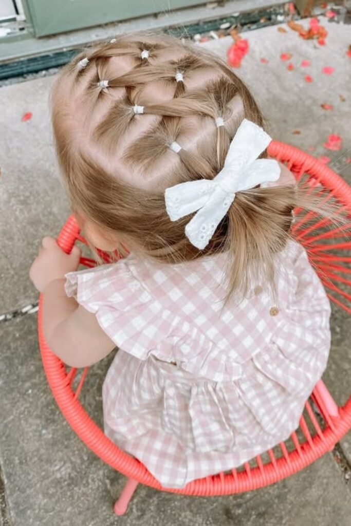 You just section the top in a V shape, braid downward, and finish with a soft velvet bow.