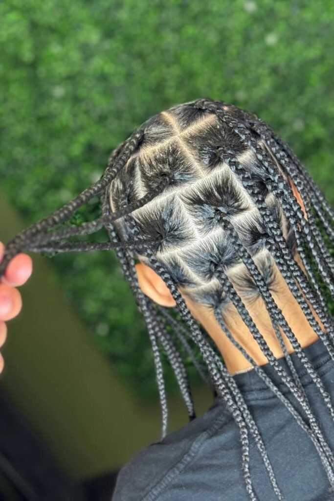 You’ll notice that a clean center part with evenly spaced boxes keeps your twists balanced.