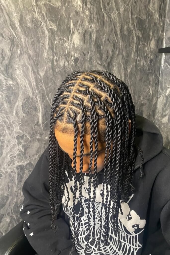 You’ll see that medium two-strand twists start from clean patterned sections and drop evenly around your head, giving your style movement instead of stiffness.