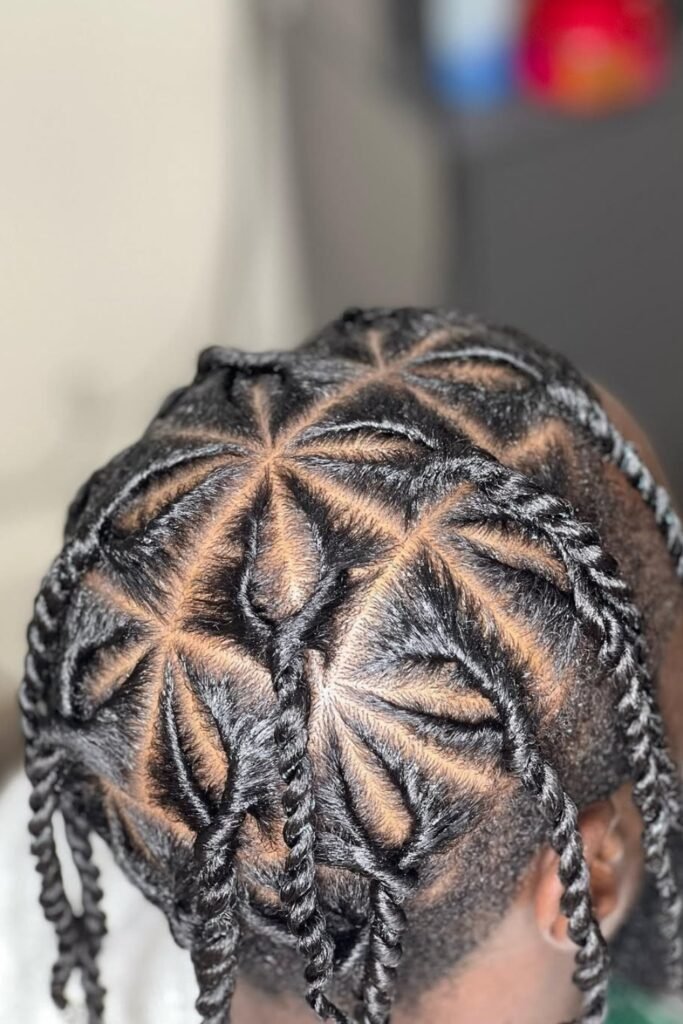 You should ask your stylist for small hexagon parts before twisting, and medium length hair works best so your twists hang evenly and the scalp pattern stays visible.