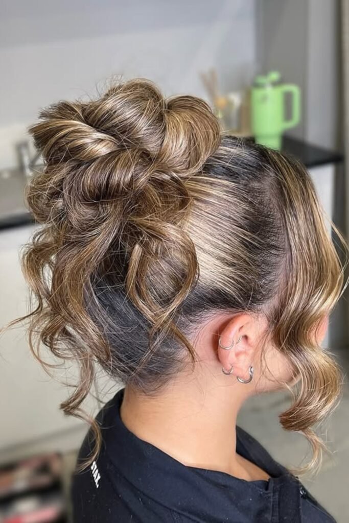 If you want playful volume with structured curls, this high bun is perfect for you.