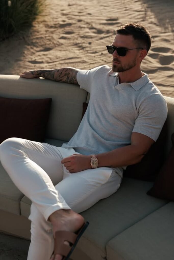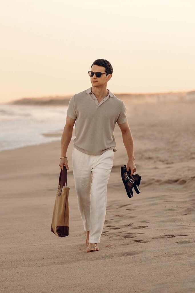 Evening beach walks call for something simple but refined, and you can wear a soft neutral polo with light linen pants to stay comfortable while looking polished.