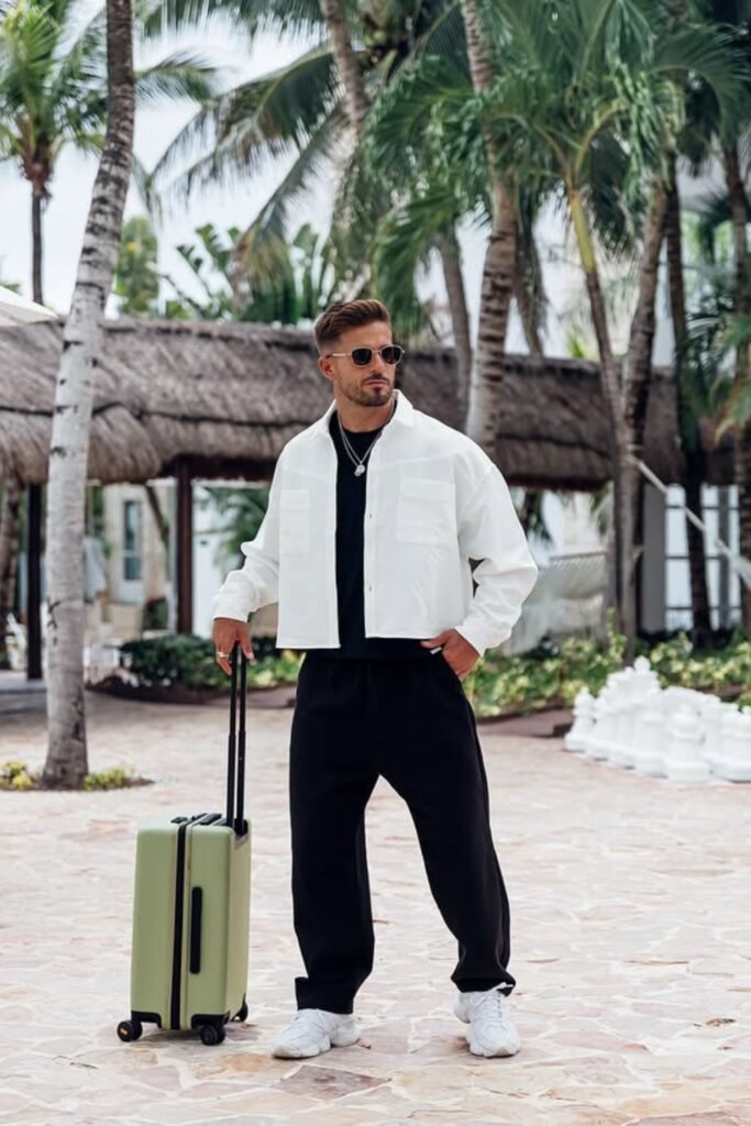 This setup works best when you want to step off the plane looking fresh instead of tired, without carrying extra layers in your hand.