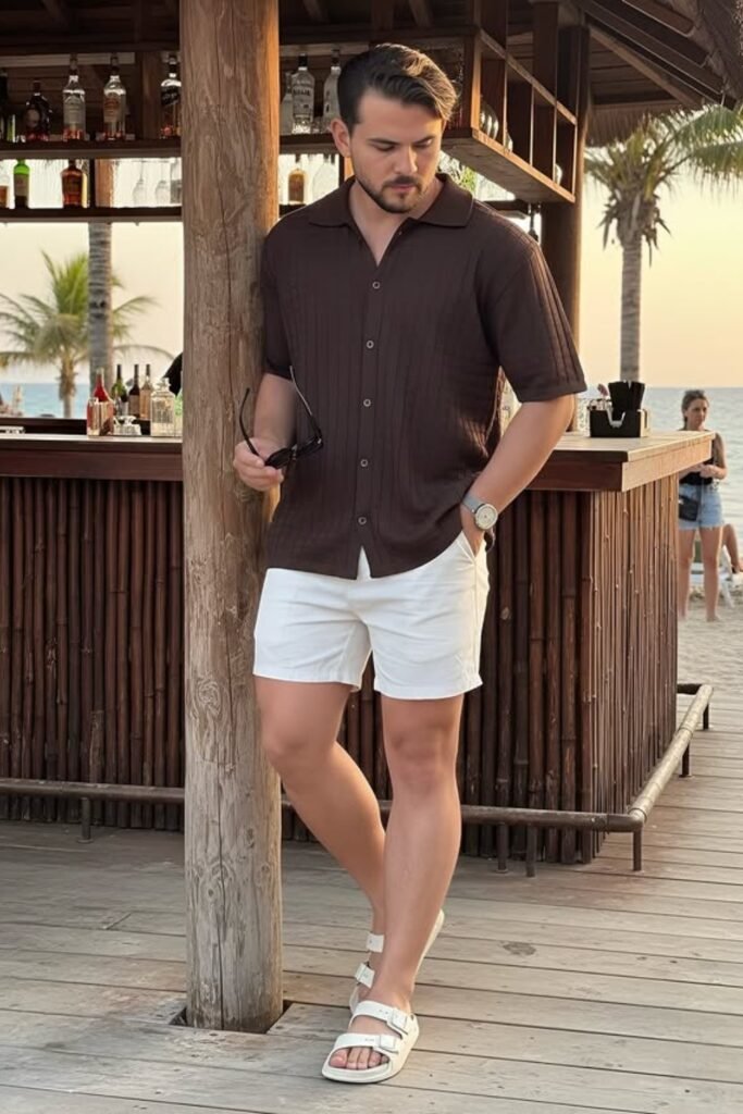 A brown short-sleeve shirt paired with white shorts creates a strong contrast that stands out without feeling heavy.