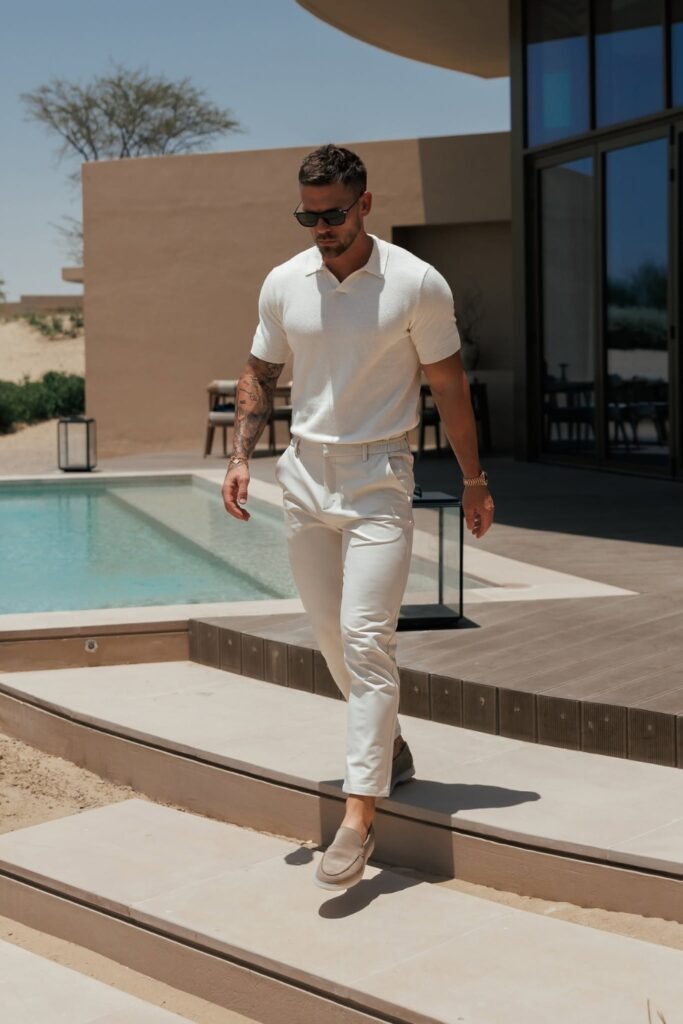 You might pair a light neutral polo with slim white pants to keep your look sharp and simple.