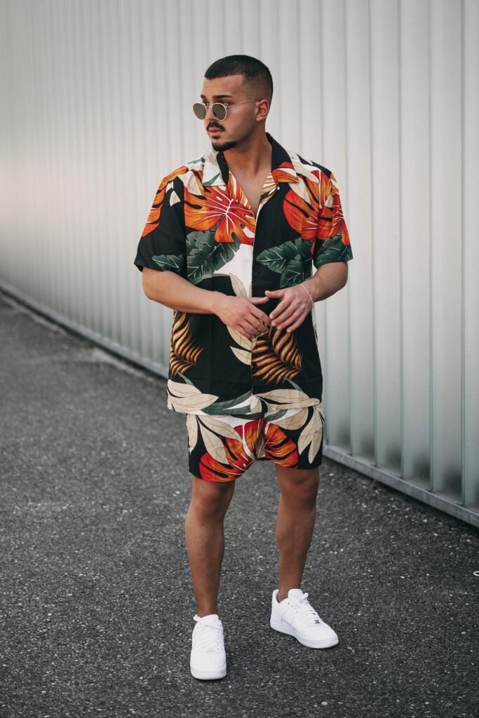 You’ll notice how a matching shirt and shorts with tropical patterns instantly gives your vacation look energy without needing extra styling.