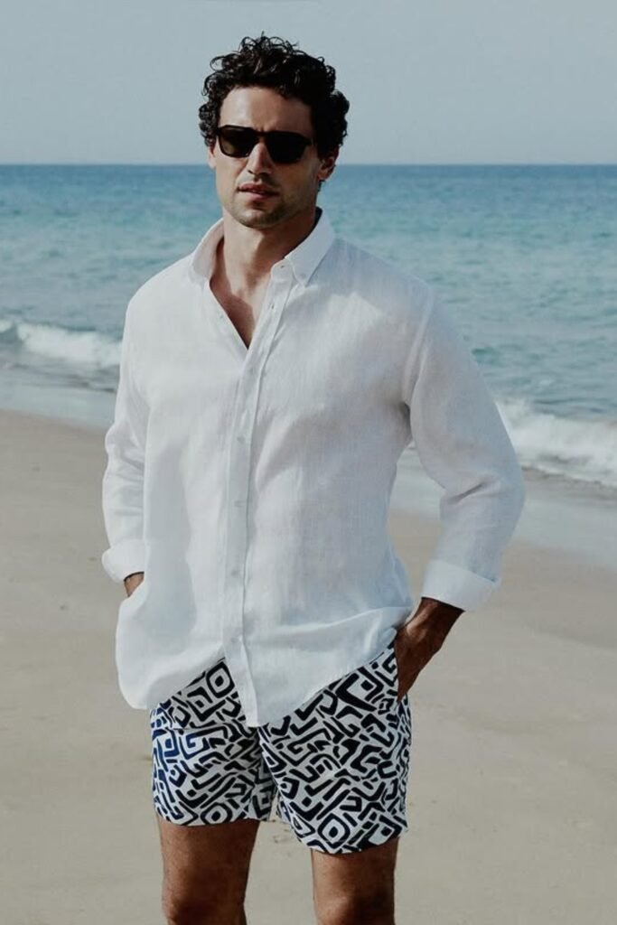 You can throw on a lightweight white shirt over printed swim shorts, and you’ll get that perfect balance.