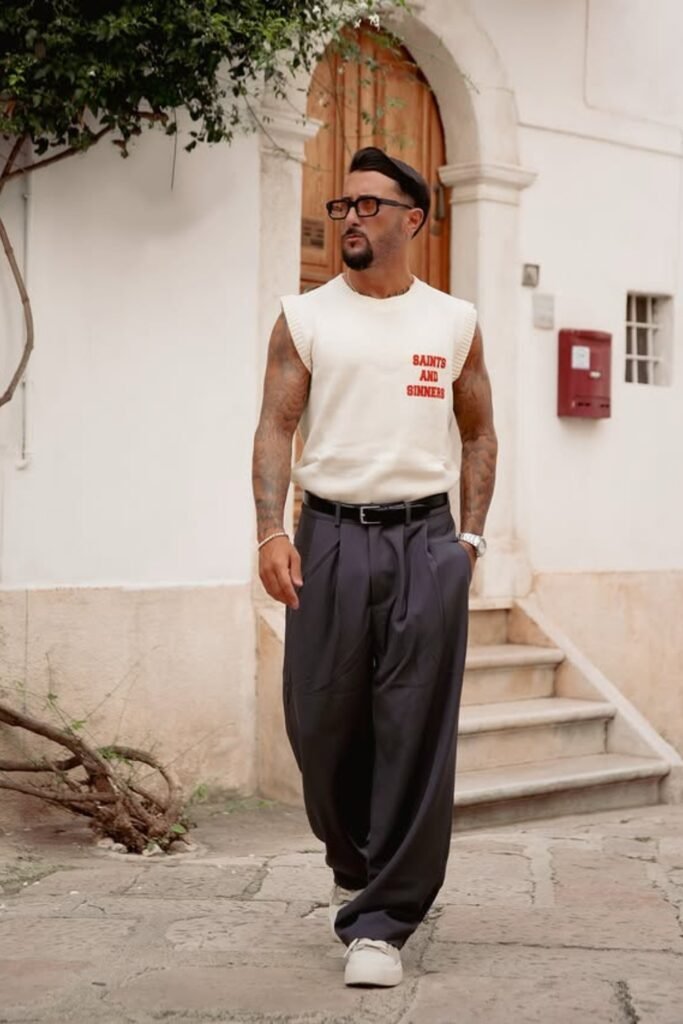 Hot city walks don’t mean you have to dress down. You can wear a sleeveless tee paired with tailored trousers to stay cool while still looking sharp.