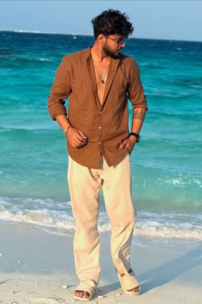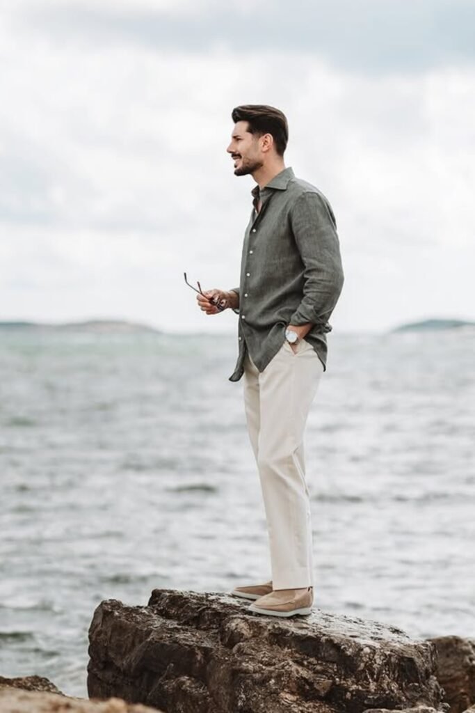 Warm tones always work better near the water, and you can wear a brown linen shirt with light beige pants for a natural, relaxed look.